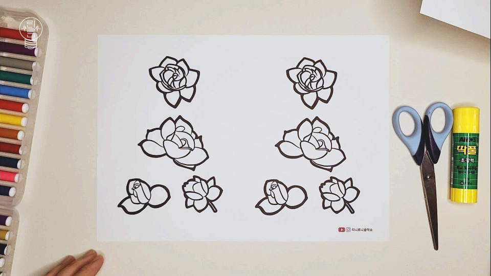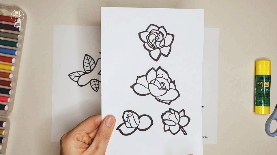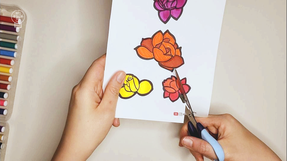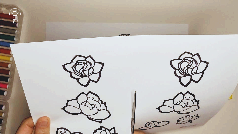 색칠이 모두 끝난 후, 장미꽃 도안을 조심스럽게 오려 주세요. 아이들이나 어르신들의 경우, 가위 사용이 미숙할 수 있으므로 안심하고 오리실 수 있도록 선을 굵게 표시해 두었습니다.