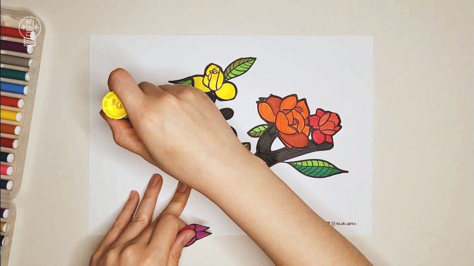 색칠할 때는 선 밖으로 너무 튀어나가지 않도록 신경 써 주세요. 정교하게 색칠하는 것이 작품의 완성도를 높여줍니다. 밖에서 안으로 결 따라 칠해주는 것이 스킬입니다.
