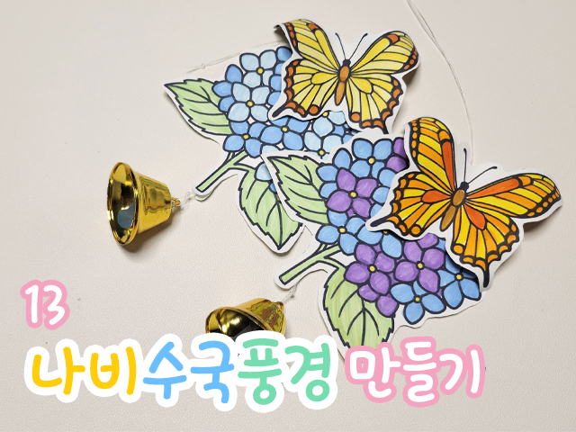 완성한 풍경은 창문이나 발코니에 걸어두면 바람이 불 때마다 종이 나비가 살랑이고 종이 울리며 은은한 소리를 냅니다. 햇빛 아래 반짝이는 수국, 흔들리는 나비의 실루엣, 그리고 바람을 타고 퍼지는 종소리는 공간을 더욱 특별하게 만들어줘요. 활동 시간은 30분에서 1시간 정도면 충분하고, 제작 난이도도 높지 않아서 부담 없이 시작할 수 있어요.