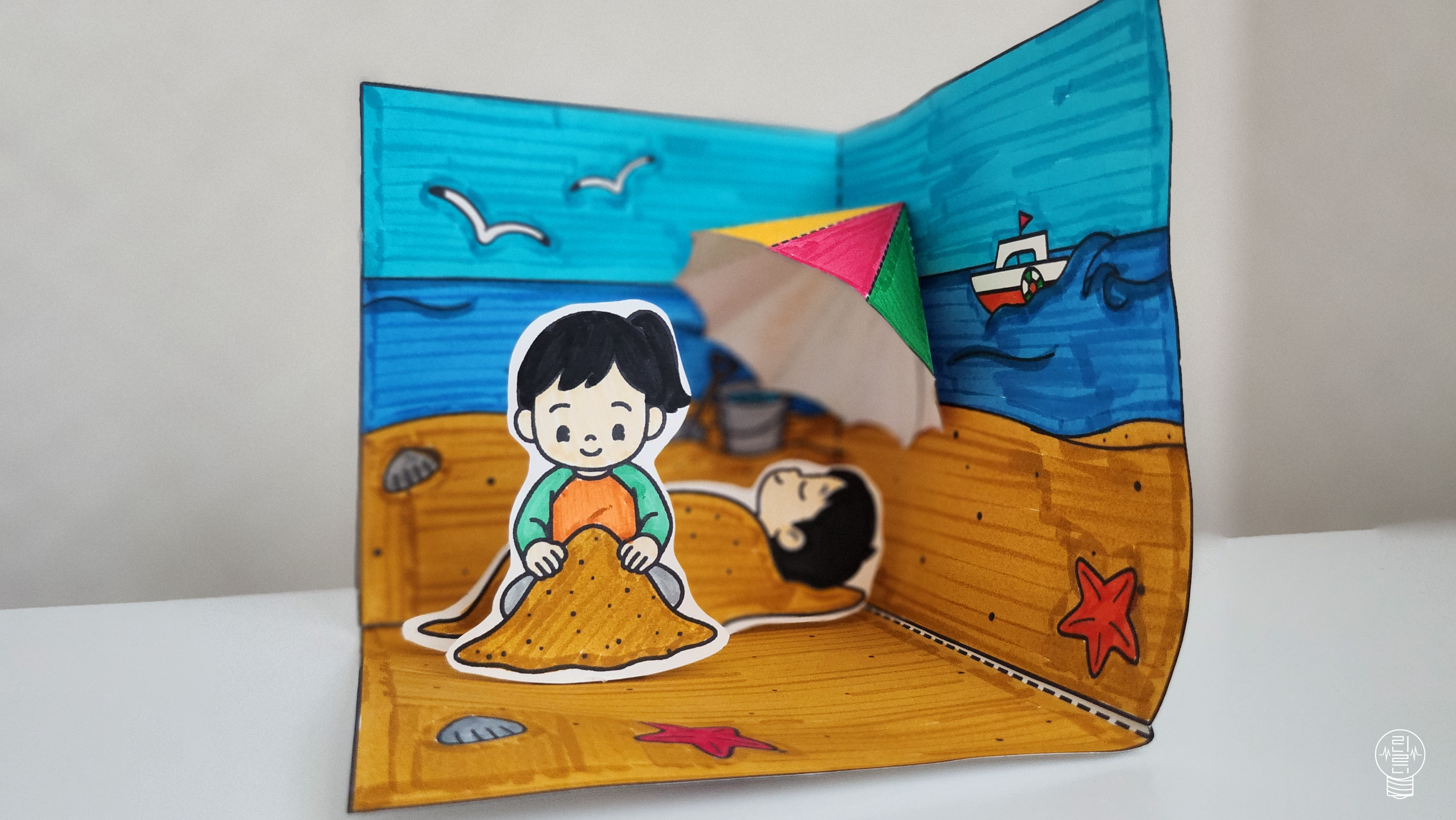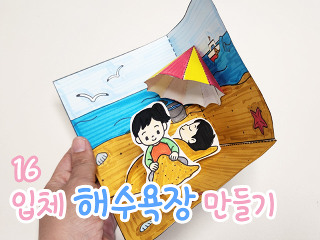 무더운 여름, 집에서 시원하게 바다를 즐기는 방법이 없을까 고민하다가 직접 해수욕장 풍경을 담은 입체 만들기 도안을 제작했어요. 여름철 휴가 분위기를 그대로 담은 이 도안은 모래사장 바닥면과 수평선이 보이는 바다 배경 2면을 이용해 작은 공간 안에 해변을 꾸미는 방식이에요. 이 위에 파라솔, 모래찜질하는 아이, 모래놀이하는 아이를 각각 입체적으로 세워주면 정말 그럴듯한 미니 해수욕장이 완성됩니다.