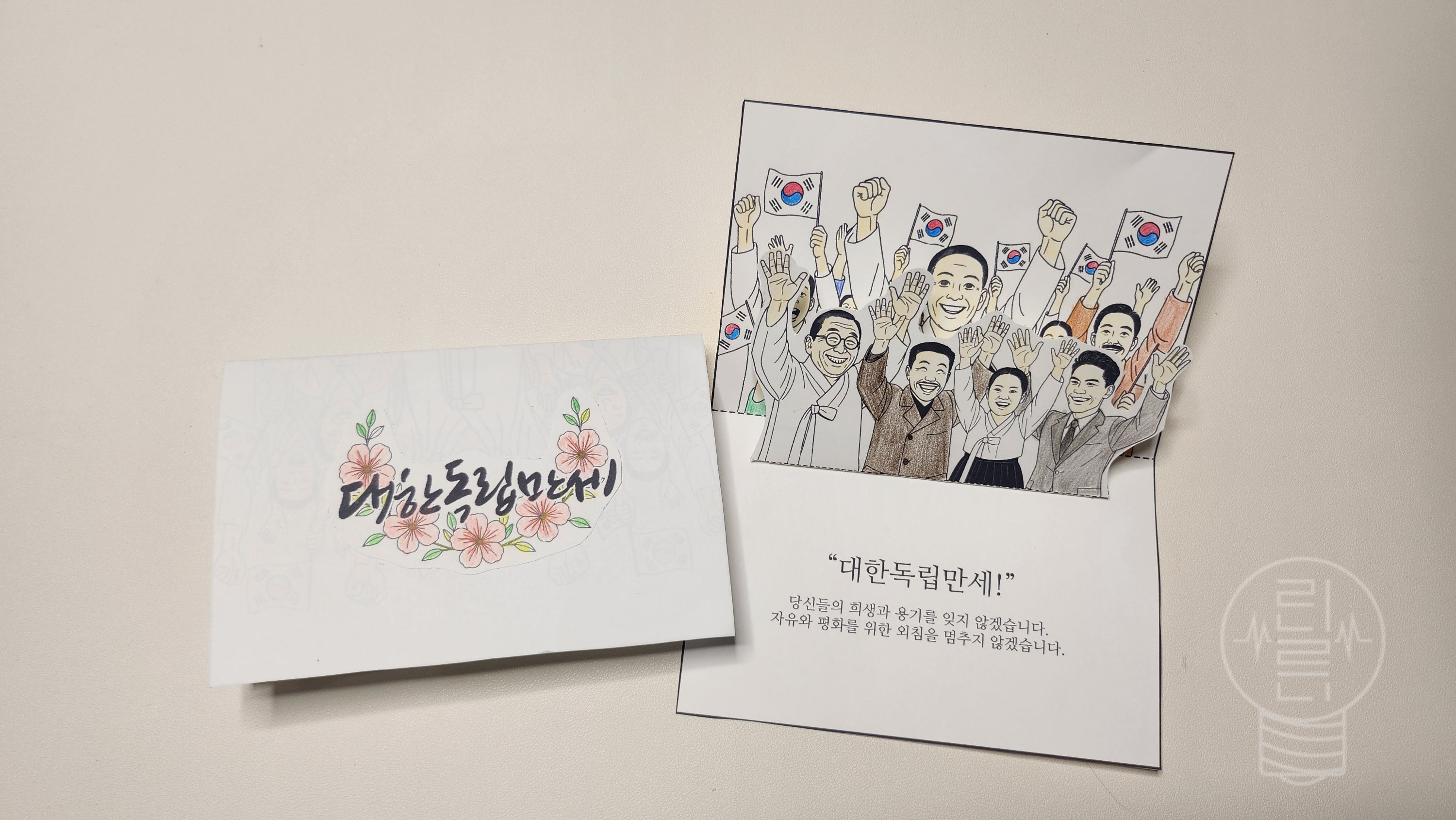 카드 안에는 태극기를 들고 만세를 외치는 군중 배경이 들어가고, 중심에는 독립운동가 4인의 모습이 입체적으로 튀어나오는 팝업 구조로 되어 있어요. 카드 표지에는 직접 색칠할 수 있는 무궁화 리스와 함께, 캘리그라피로 쓴 “대한독립만세” 문구가 담겨 있어 한층 의미 있고 감동적인 결과물이 완성됩니다.